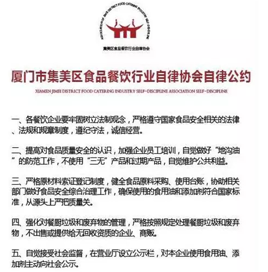 今年4月,厦门市首个食品行业自律协会——厦门市集美区食品餐饮行业自律协会在集美区成立。由区市场监督管理局指导和协调成立的自律协会涵盖从食品生产、流通及餐饮三个环节,截至目前,集美辖区已有味友、临家、大丰收、京闽北海湾、三德利等58家食品企业加入协会。对于这些加入自律协会的会员单位,自律协会一方面制定了严格的规章制度和行业评定标准进行约束,并以悬挂金字招牌的方式向社会公示;